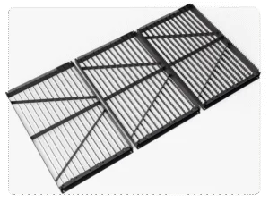 Wymienne ruszty stołu roboczego do wycinarki laserowej, wykonane z modułowych segmentów z gęstymi zębami podpierającymi arkusz podczas cięcia.